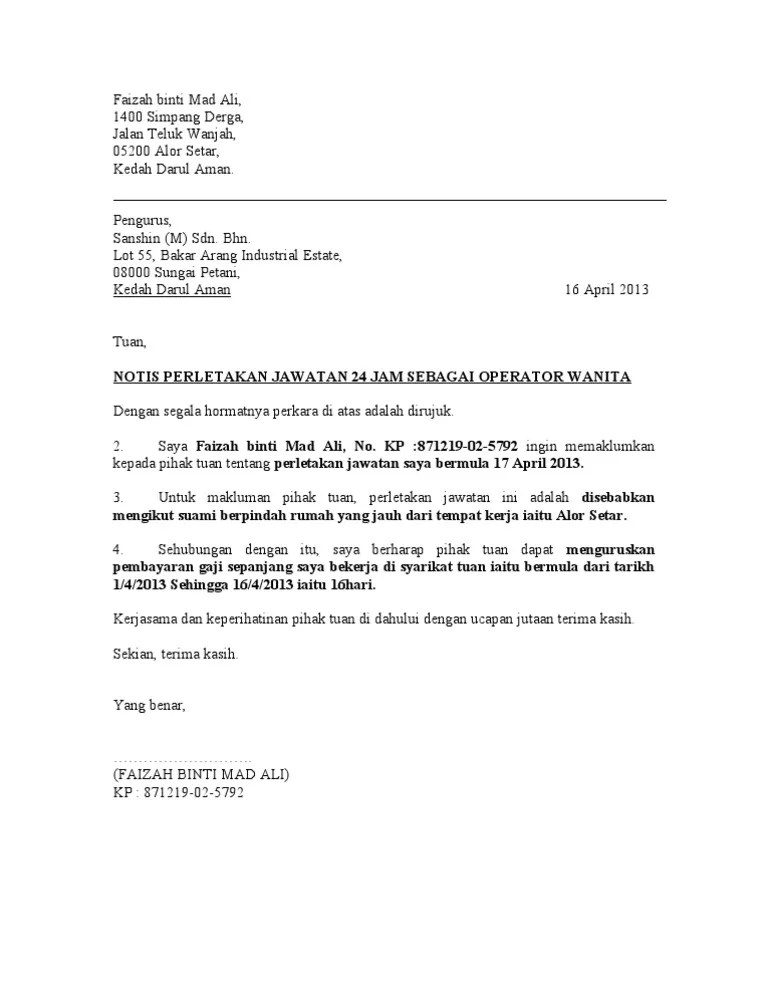 Surat Perletakan Jawatan Notis 24 Jam / Surat Letak Jawatan Ringkas Nashcxt. Contoh surat berhenti kerja (bm), koleksi surat perletakan jawatan resignation letter terbaik notis kerja 24 jam & notis sebulan. Dalam offer letter tidak dinyatakan berkenaan notis perletakan jawatan. Jadi, boleh ikuti contoh surat perletakan jawatan ini. Surat berhenti kerja notis 24 jam. Tiba2 pada 25hb boss call suruh kawan saya letak surat berhenti 24jam sebab dia .